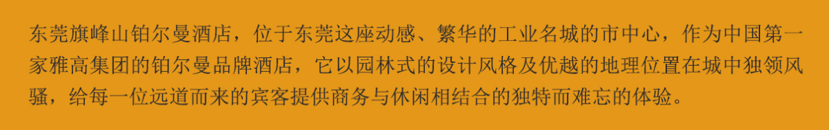東莞旗峰山鉑爾曼酒店,位于東莞這座動感、繁華的工業(yè)名城的市中心,作為中國第一家雅高集團(tuán)的鉑爾曼品牌酒店,它以園林式的設(shè)計風(fēng)格及優(yōu)越的地理位置在城中獨(dú)領(lǐng)風(fēng)騷,給每一位遠(yuǎn)道而來的賓客提供商務(wù)與休閑相結(jié)合的獨(dú)特而難忘的體驗。